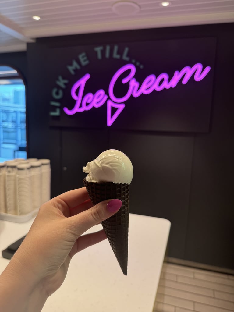 You’re on vacation, and we’ve already covered fitness options, so fully enjoy the delicious, included sweets onboard. Don’t miss the hand-scooped ice cream parlor, the popsicle and Prosecco cart in the food court, and the affogato cart at Extra Virgin Italian. Made tableside, the affogato features a scoop of gelato, espresso, and your choice of toppings. Yum!